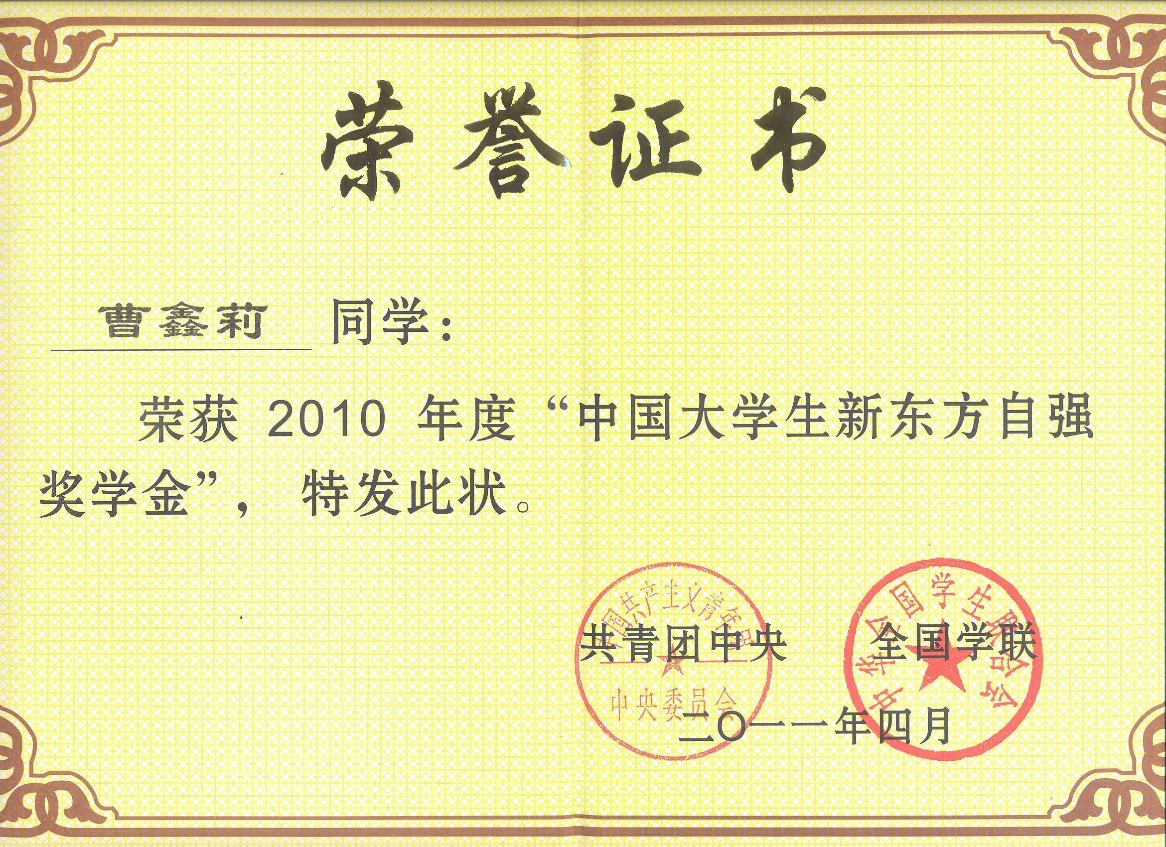 近日,由共青团中央、全国学联主办的2010年度“中国大学生自强之星”评选活动尘埃落定,我校电气信息工程学院曹鑫莉同学获得“中国大学生自强之星”提名奖,同时获得由新东方教育科技集团提供的2000元“中国大学生新东方自强奖学金”。