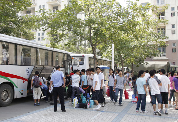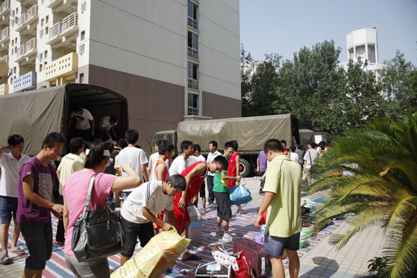 早上5点30分,回迁工作正式开始。学校组织了10辆大客车和10辆大卡车投入回迁运输工作,运输车辆按批次将1848名回迁学生和他们的行李运送到东风校区。经过近一天的紧张工作,回迁学生顺利入住东风校区各个学生生活园区。