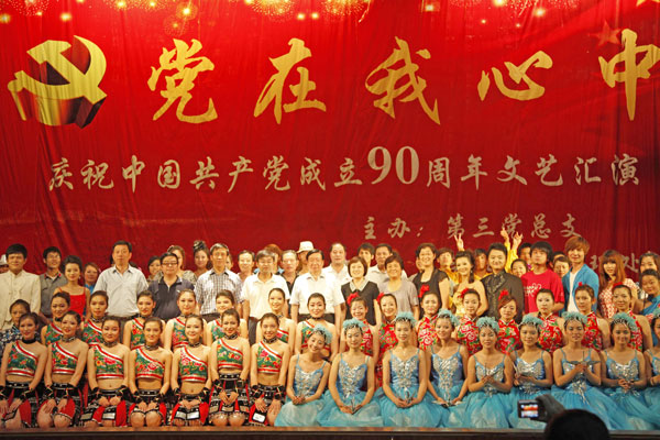 6月9日下午,第三党总支庆祝中国共产党成立90周年“党在我心中” 文艺汇演在学校大礼堂举行。党委书记林世选,副校长赵继红、安士伟出席活动,并与各合作办学单位党委书记、分管学生工作校领导、学生党支部负责人、团委及学生处负责人等一起观看了演出。