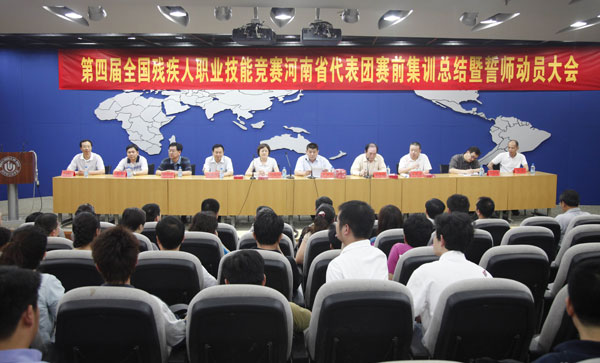 6月8日下午,第四届全国残疾人职业技能竞赛河南省代表团赛前集训总结暨誓师动员大会在我校隆重举行。副校长赵继红与河南省残联副理事长李国成、董予德一起出席了总结暨誓师动员大会。省残联有关部门负责人、我校各承训单位和有关部门负责同志、指导教师代表、竞赛选手及相关工作人员共70余人参加会议。大会由省残联副理事长董予德主持。