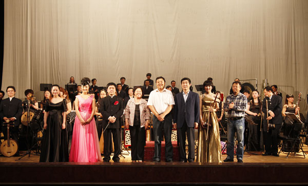 演出结束后,观看演出的领导上台与演职人员握手、合影,祝贺演出成功。