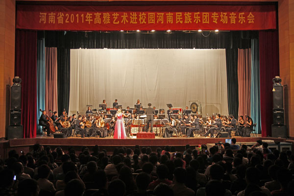 5月24日晚,省教育厅主办的“高雅艺术进校园”活动再一次来到我校,由河南民族乐团的艺术家们为千余名师生奉献了一场格调高雅、形式新颖的民族音乐会。党委副书记张胜利、窦效民,河南民族乐团团长兼演出总监杜红亚等领导和嘉宾出席音乐会并观看了演出。演出在东风校区大礼堂举行。