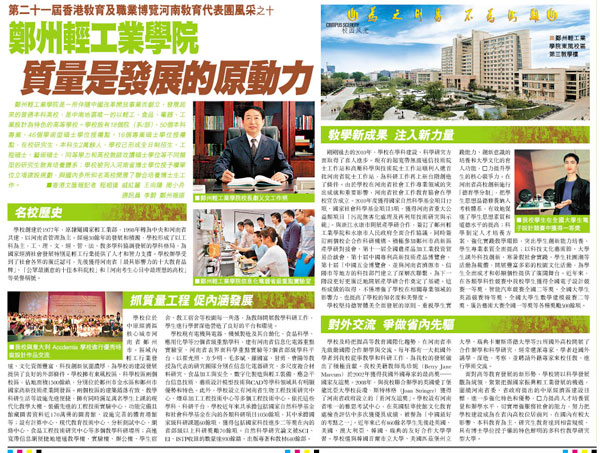 展会上,我校代表团以展板形式图文并茂地展示了学校教学与人才培养、学科建设、科学研究、师资队伍、办学条件、对外交流与合作等方面的情况,并散发精心准备的学校宣传画册、郑州轻工业学院留学生招生简章、郑州轻工业学院研究生招生简章和郑州轻工业学院本科生招生简章等宣传材料。同时,由于我校展位位置醒目、特色明显、材料丰富,受到了参观博览会的家长、学生、媒体以及高校同行的广泛关注。2月17日的香港文汇报以《郑州轻工业学院 质量是发展的原动力》为题,详细报道了我校整体发展情况。
