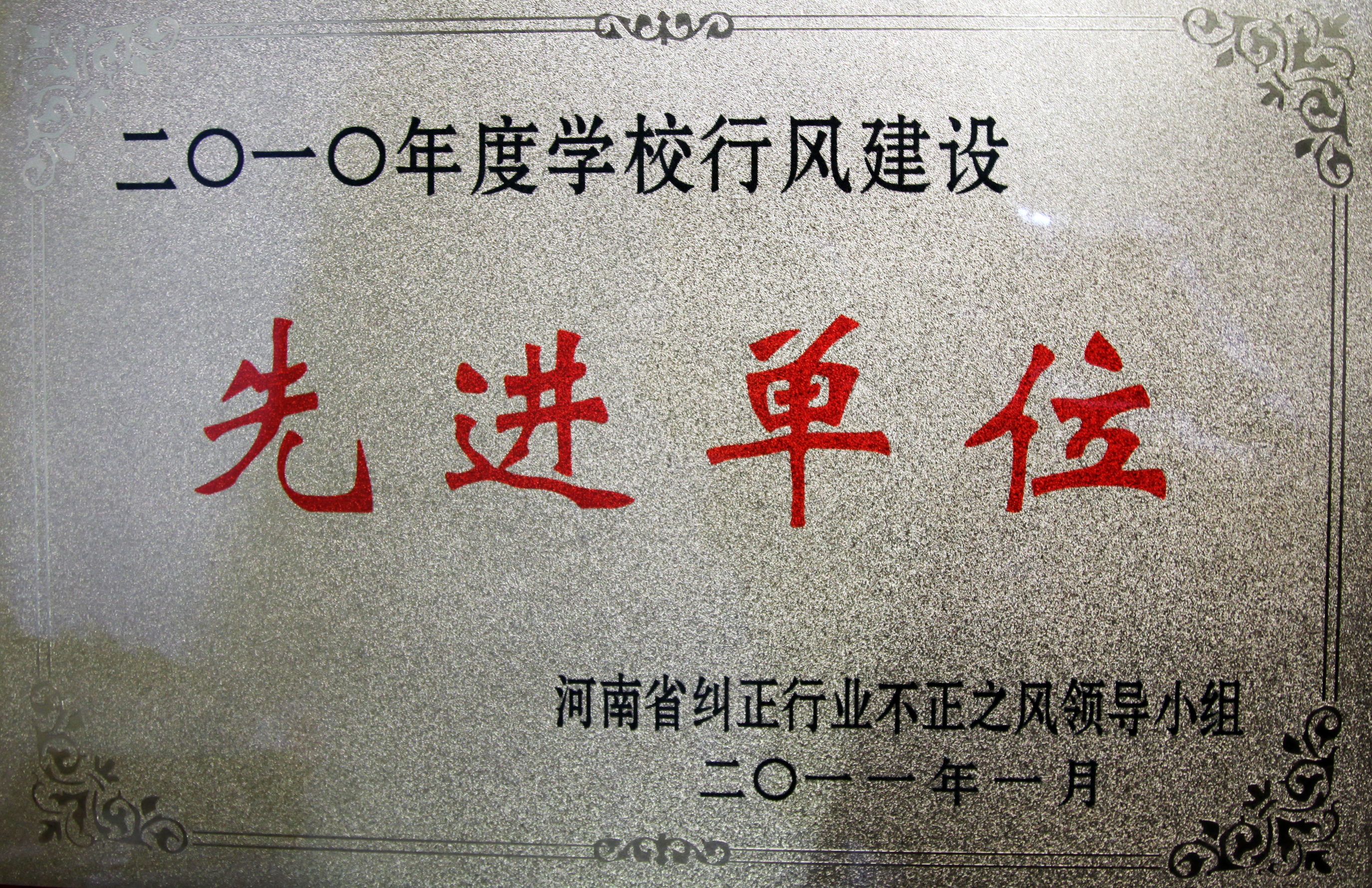 1月25 日 ,河南省人民政府纠风办公室下发了《河南省纠正行业不正之风领导小组关于2010年民主评议省管大中专院校及部分中小学校行风考核结果的通报》文件,通报了全省 2010 年民主评议政风行风考核评议结果。我校在参评的 34所省管本科院校中获得第一名的好成绩,被授予“ 2010 年度全省学校行风建设先进单位”荣誉。在过去的2008年、2009年行风评议中,我校分别获得全省本科院校总评第一、第三名的优秀成绩,连续三年受到省政府的表彰。
