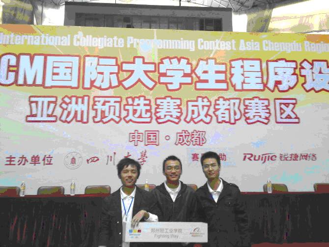 日前,第35届ACM/ICPC国际大学生程序设计竞赛亚洲区(成都赛区)的比赛落下帷幕,由我校计算机学院计算机08-1班的史佳宾、电子08-1班的李伟、计算机09-2班朱亚伟三位同学组成的我校代表队Fighting Way队奋勇拼搏,勇创佳绩,荣获铜奖。这是今年河南高校在该项赛事中的最好成绩。