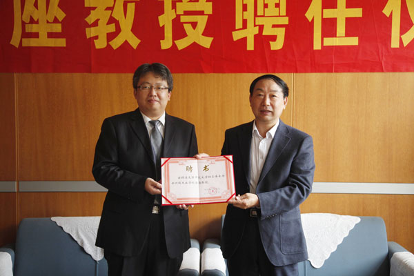 会上,校长剧乂文教授代表学校对杜淼教授到我校工作表示欢迎,他对杜淼教授取得的丰硕成果表示祝贺,并相信随着双方的进一步合作,定会增强我校材料学学科方向的发展,为博士点建设、人才培养等做出更大的贡献,并表示学校会全力为双方的合作提供更好的平台。他还向杜淼教授颁发了客座教授聘任证书。
