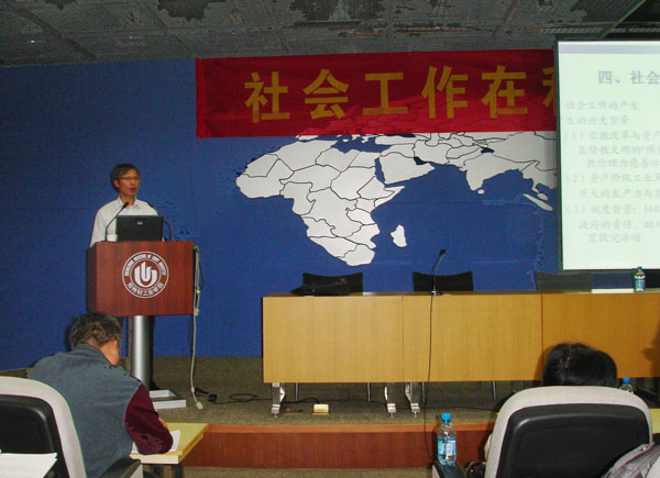 向德平教授结合当前社会建设的形势和社会热点问题,深入浅出地介绍了社会工作的本质、对象、要素、历史发展以及在和谐社会建设中的作用等等。报告使与会师生对社会工作在当前社会建设中的重要意义有了更加深刻的认识,增强了社会工作专业学生对于职业发展前景的信心。