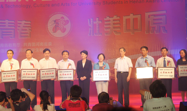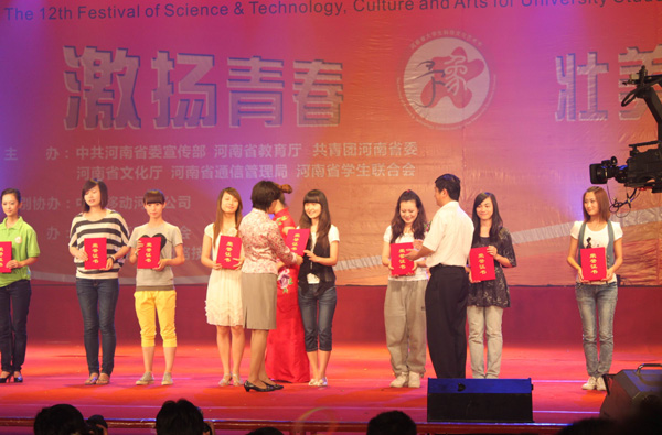 6月12日晚,由省委宣传部、省教育厅、团省委、省文化厅、省通信管理局、省学联共同举办的河南省第十二届大学生科技文化艺术节颁奖晚会在河南省青少年宫隆重举行。省委常委、宣传部长、副省长孔玉芳出席并为获奖单位颁奖。我校党委副书记张胜利作为获奖单位代表参加活动。