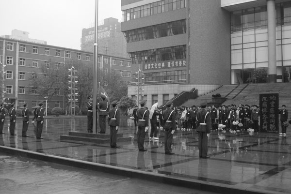 21日是玉树地震国家哀悼日,学校组织师生开展了不同形式的哀悼活动,向玉树地震遇难同胞致哀,共同祝愿逝者安息、生者坚强。当天早上7时整,部分学生在图书馆广场参加了一场特殊的升旗仪式。五星红旗在国歌声中升起又缓缓降半,同学们胸带白花,面对国旗肃立垂首,沉痛哀悼青海玉树地震遇难同胞。