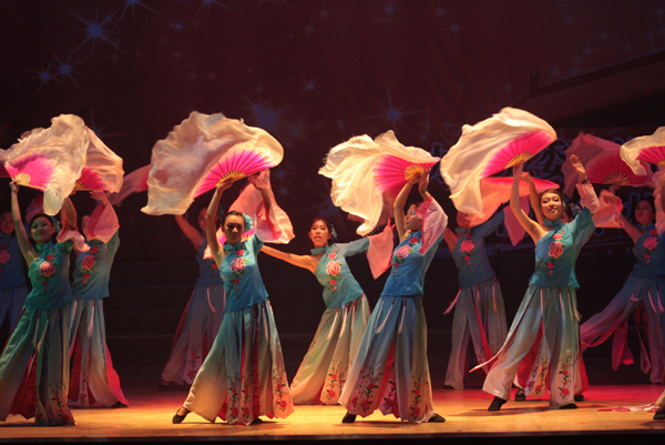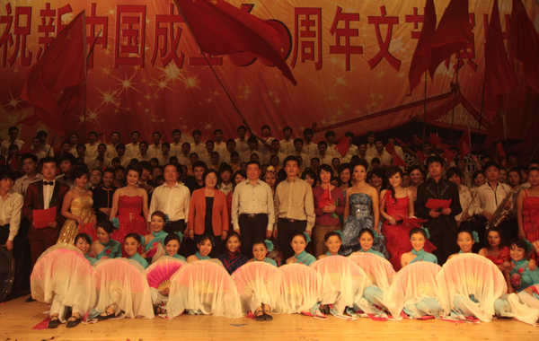 我校庆祝新中国成立60周年文艺晚会在歌伴舞《爱我中华》中拉开帷幕