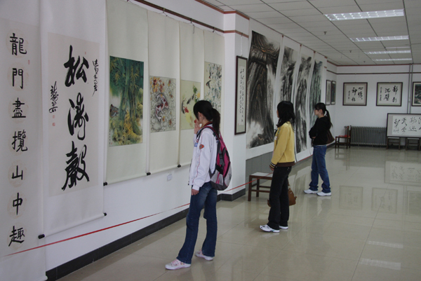 近日,我校迎国庆60周年的系列活动之“‘祖国・您好’庆祝新中国成立60周年书画展”吸引了众多师生的关注,大家在书画作品中间徜徉,在艺术欣赏中感受着祖国60年来的喜人变迁。此次展览由党委宣传部、校工会、艺术设计学院联合主办。