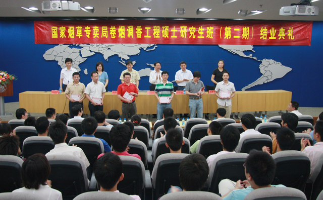 2007年10月,27名来自全国17省、18家烟草企业的技术骨干,经过国家烟草专卖局选派,进入我校学习,本期培训本着提高调香技术人员素质,培养实用型调香技术人才,加强烟草行业卷烟调香人才队伍建设的总体目标,在国家烟草专卖局以及我校领导的亲切关怀和支持下,在相关教职工和研究生班全体学员的共同努力下,顺利完成了预定的教学任务以及其他各项工作,取得了良好的教学效果,19名学员通过学习,通过了GCT考试,达到了工程硕士录取分数线。