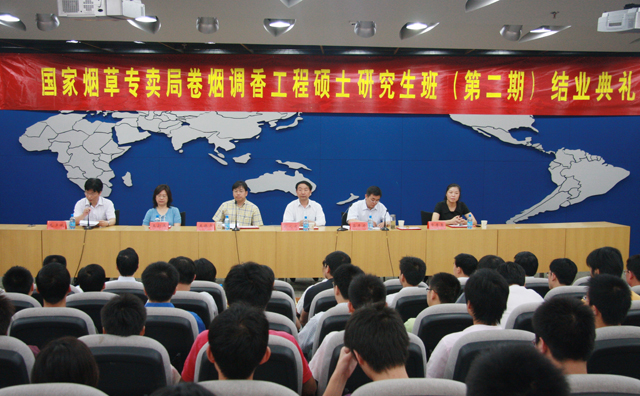 6月1日,国家烟草专卖局卷烟调香工程硕士研究生班(第二期)结业典礼在我校图书馆报告厅隆重举行。校长剧乂文、副校长吕彦力、国家烟草专卖局科教司处长王德平出席典礼。研究生处、食品与生物工程学院有关负责同志,研究生班全体学员、任课教师代表、烟草专业本科学生代表参加典礼。食工学院院长毛多斌主持典礼仪式。