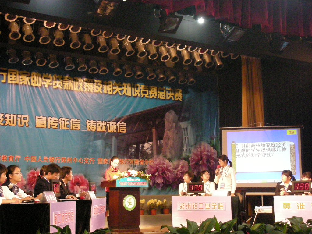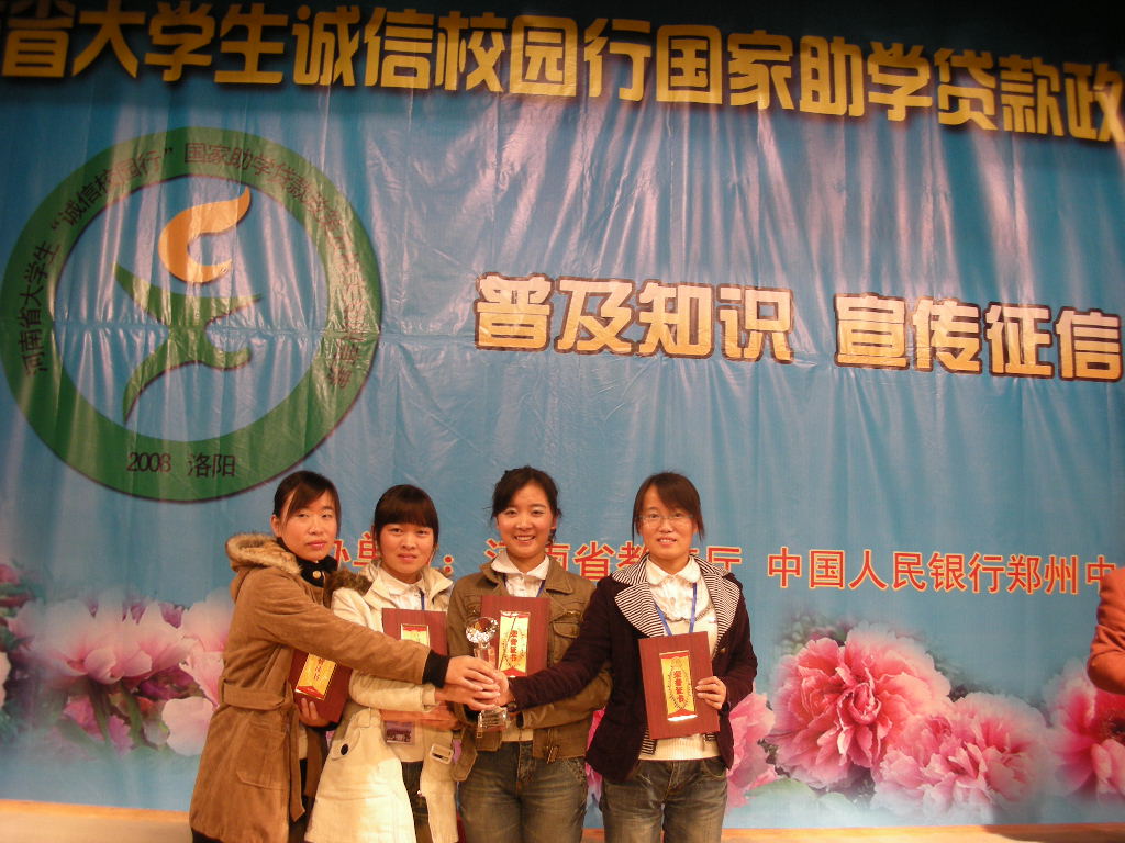 日前,由河南省教育厅、中国人民银行郑州中心支行、国家开发银行河南省分行共同主办的河南省大学生“诚信校园行”国家助学贷款政策及相关知识大赛总决赛在洛阳师范学院落下帷幕。我校代表队以扎实的知识水平和良好的心理素质,从全省25支高校代表队中脱颖而出,获得银奖。