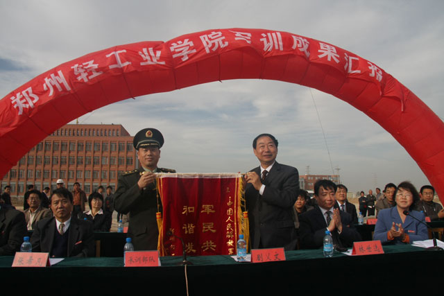 在雄壮的军乐声中,党委书记林世选教授检阅了军训方队。校长剧乂文教授代表学校向71834部队赠送了锦旗。