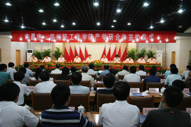 剧乂文校长在签约仪式上致辞,代表学校对协议的签署表示祝贺,向支持和关心我校建设与发展的各级领导和社会各界朋友表示感谢,并向与会领导嘉宾简要介绍了我校近年来建设发展的情况。他指出,科技、教育和经济社会的良性互动,人才、知识和资本的有效结合,是推进经济增长方式根本转变的重要动力。双方产学研战略合作协议的签订,既为我校充分发挥自身在科技、人才资源等方面的优势,服务地方经济建设和社会发展开辟了新的空间,又为许昌市发挥资金、市场优势,全面提升企业的科技水平和产品的竞争力搭建了坚实的平台,这必将促进“以企业为主体,市场为导向,产学研相结合”的技术创新体系建设,实现双方资源共享、优势互补、互利互惠、共同发展。他相信,通过双方的共同努力,郑州轻工业学院与许昌市的产学研战略合作一定能开出灿烂之花,结出丰硕之果。