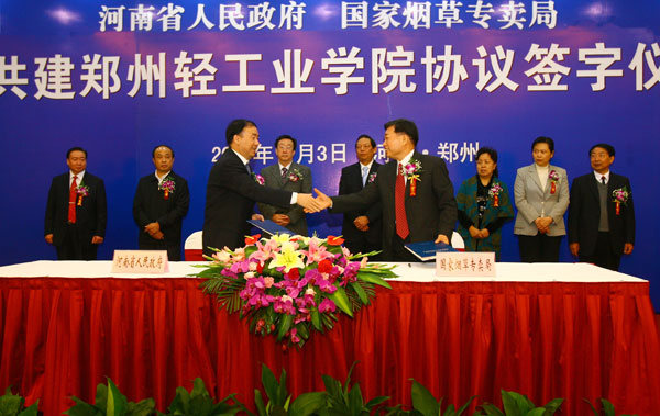 11月3日,省人民政府和国家烟草专卖局在郑州签署共建郑州轻工业学院协议