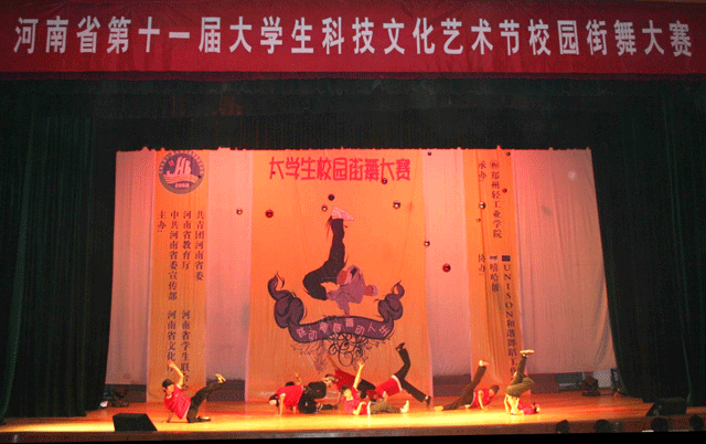 5月5日―7日,我校承办的河南省第十一届大学生科技文化艺术节校园街舞大赛隆重举行。包括我校在内的全省64所高校、81支队伍报名参加了比赛。我校大学生街舞队顽强拼搏,取得优异成绩,获得健身街舞组和流行街舞组两个第一名。