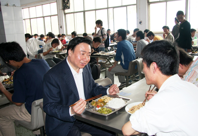 检查结束后,林世选书记、张胜利副书记、龚毅副校长一行和学生一起在食堂共进午餐。