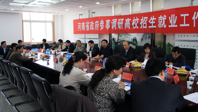4月21日下午,河南省高校招生与就业协调机制调研座谈会在我校二楼大会议室举行。省政府参事李文成、邓庆州等11人,我校校长剧乂文、党委副书记张胜利、副校长陈江风出席座谈会。河南工业大学、河南中医学院、河南财经学院、中原工学院、郑州航空工业管理学院、华北水利水电学院等6所本科院校相关工作负责人,以及我校各相关部门负责人参加座谈会。