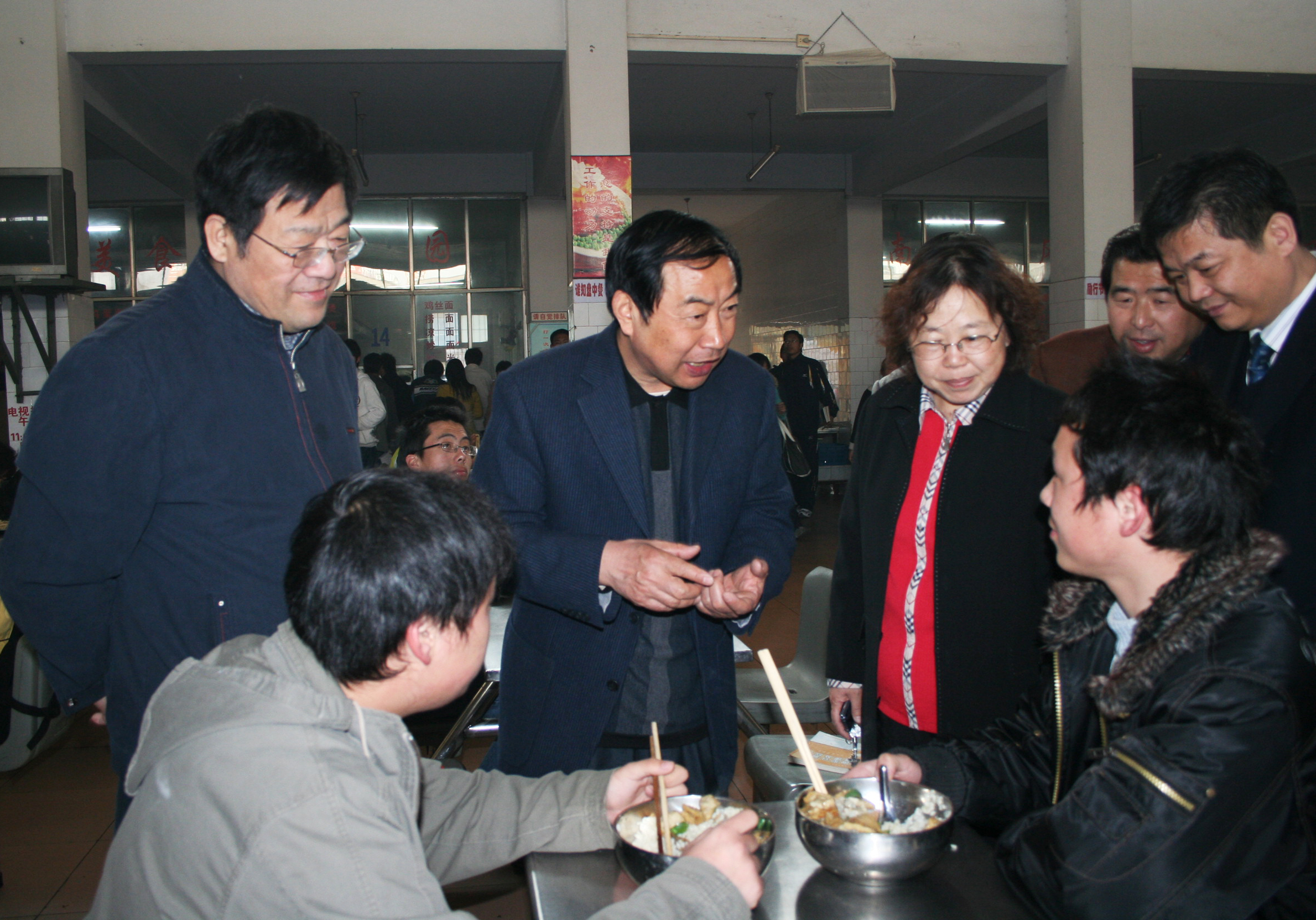剧乂文校长、张胜利副书记、龚毅副校长一行还在食堂和同学们一起共进午餐。