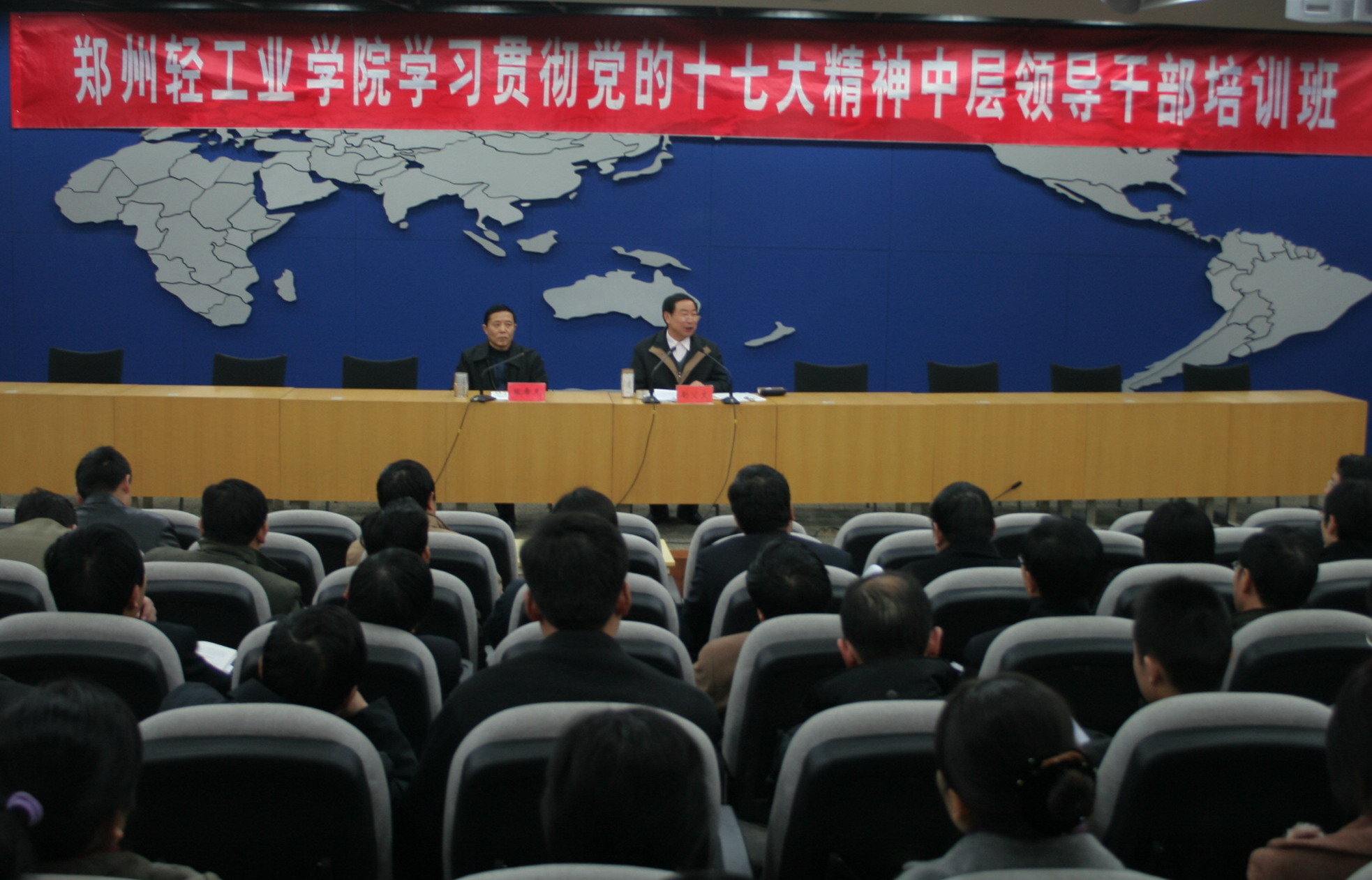 12月12日下午,校长剧乂文教授在图书馆学术报告厅为学习贯彻党的十七大精神中层干部培训班学员作了一场题为“把握十七大对教育发展的新要求,促进我校教育事业的新发展”的专题报告。全体中层干部,教授、博士代表,党支部书记,部分科级干部参加了报告会。报告会由党委副书记张希凡同志主持。
