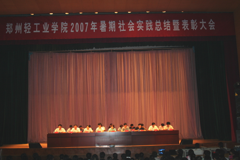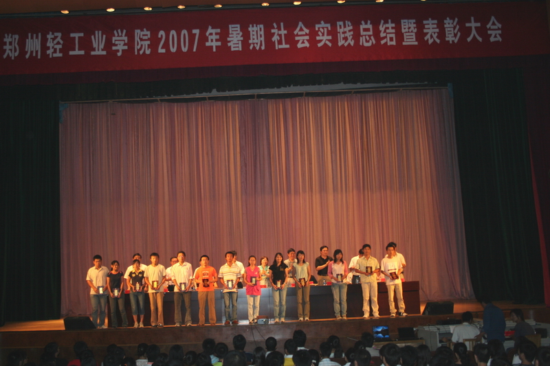 表彰大会在雄壮的国歌声中拉开序幕,校团委书记郭涛宣读了《关于表彰郑州轻工业学院2007年暑期社会实践活动先进个人的决定》。在随后举行了颁奖仪式上,出席会议的领导分别向各院(系)获得省、市、校级先进个人称号的学生代表颁发了荣誉证书。