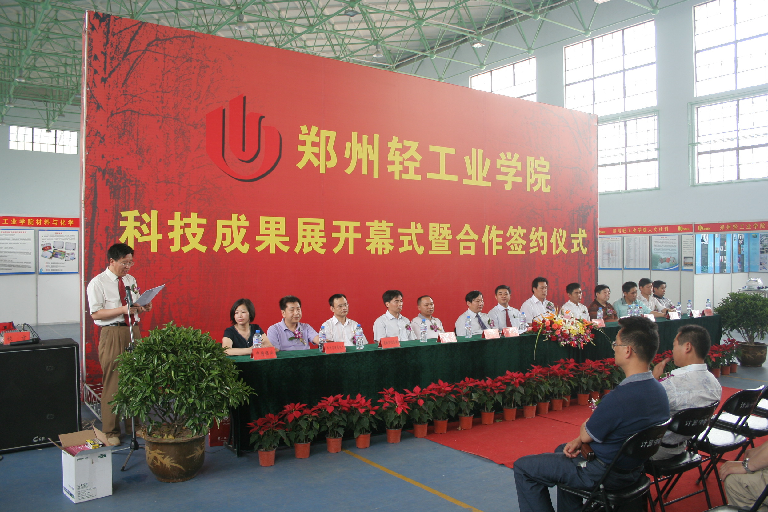 科技成果展及合作签约仪式由科技处处长王军主持。副校长吕彦力和许昌市副市长王登喜在签约仪式上分别发表了热情洋溢的讲话,并代表双方签署了全面合作协议。河南莲花味精股份有限公司总经理高君代表11家签约企业也发表了讲话,对我校三十年校庆及科技工作取得的成绩表示祝贺。各签约企业代表及我校有关院系负责人、职能部门负责人、学生代表共二百余人参加了签字仪式。