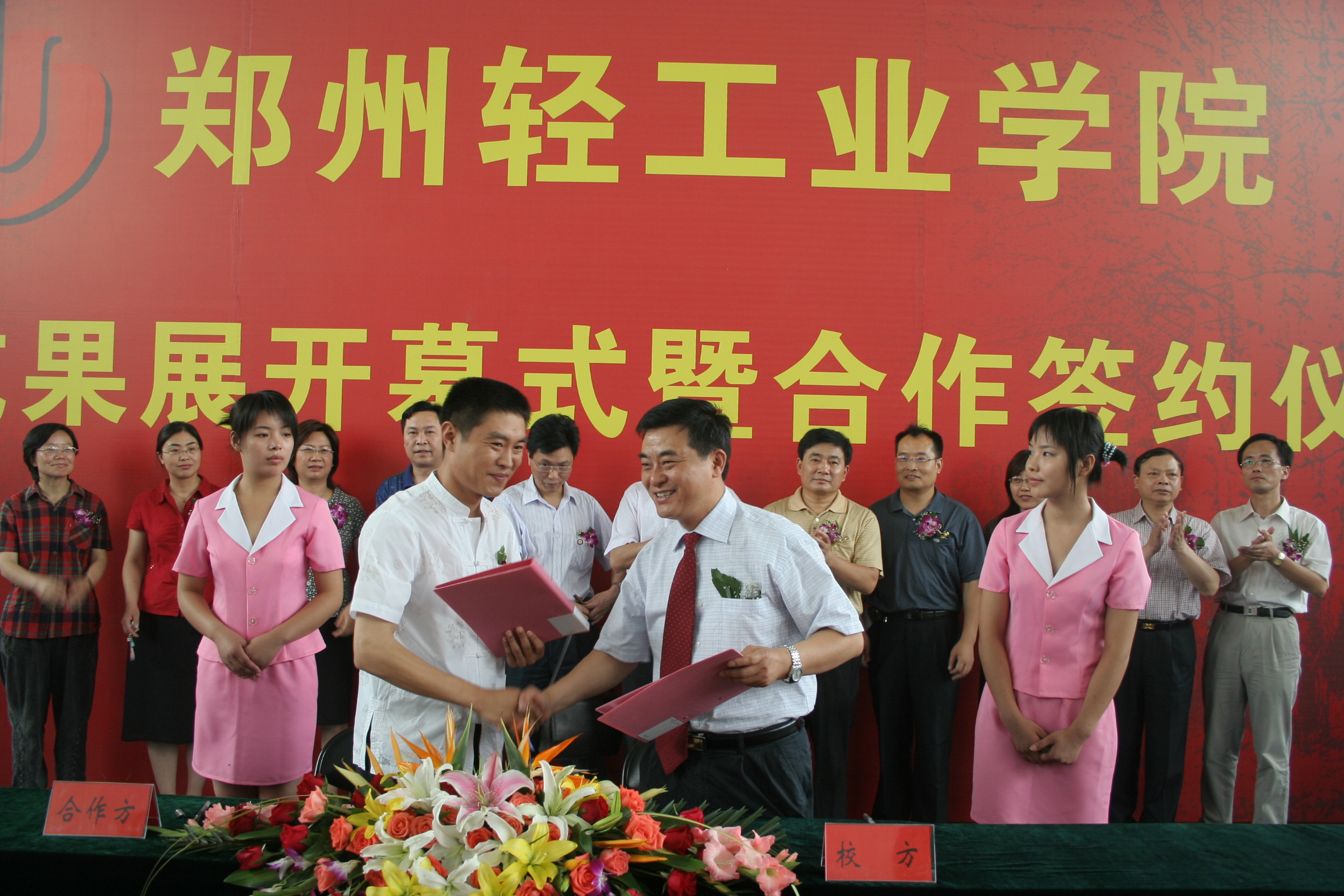 6月9日上午,科技成果展示发布会及校市、校企合作签约仪式隆重举行。我校与许昌市人民政府签署了全方位合作框架协议;与河南莲花味精股份有限公司等5家企业签署了联合进行科技合作、人才培养、研究基地建设等领域的产学研合作协议;与河南鑫泰塑胶有限公司等6家企业就化工、信息控制、烟草加工、工业设计等研究领域签定了科技开发协议。