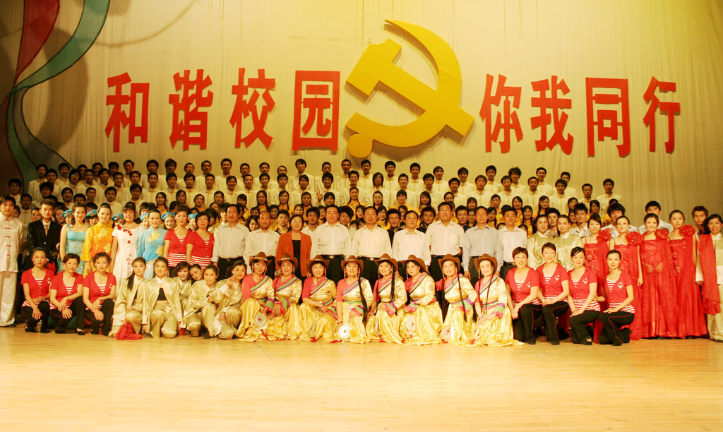 演出结束后,校领导走上舞台祝贺演出的成功,并与大学生艺术团等单位演职人员合影留念。