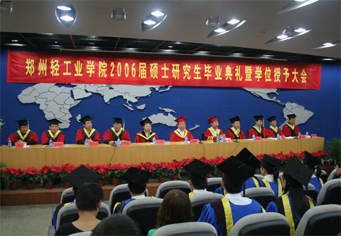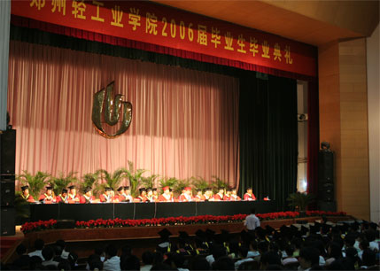 首先进行的是2006届本科毕业生毕业典礼暨学位授予仪式,大会由副校长龚毅主持。会上,校党委副书记张胜利宣读了“关于表彰2006届优秀毕业生的决定”和“关于表彰2006届‘十佳毕业生’的决定”,副校长陈江风宣读了“郑州轻工业学院关于授予李春丽等2006届本科毕业生学士学位的决定”和“郑州轻工业学院关于授予吴琼等2006届成人本科毕业生学士学位的决定”,随后校领导向获奖同学和毕业生代表颁发了获奖证书、毕业证书和学士学位证书。毕业生代表王佼佼畅谈了他在轻院四年的收获和喜悦,他感谢老师们的精心培养和无私奉献,并表示今后的工作生活中一定会奋发努力,为轻院争光。