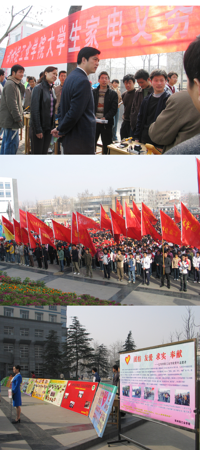 仪式上,团省委陶明伦书记指出,举行“争做志愿者,建设新农村”志愿服务招募仪式是新形势下学习雷锋精神的新举措,是对雷锋的最好纪念。活动现场气氛热烈,我校广大同学踊跃报名,争做志愿者,并以宣传板、宣传页等形式向兄弟院校展示我校近年来开展青年志愿者活动取得的成绩。我校家电义务维修小分队还在农业路边摆起摊子,为过往市民义务维修家用电器,他们的辛勤工作得到了团省委陶明伦书记、团省委学校部曹克舜部长的高度评价。