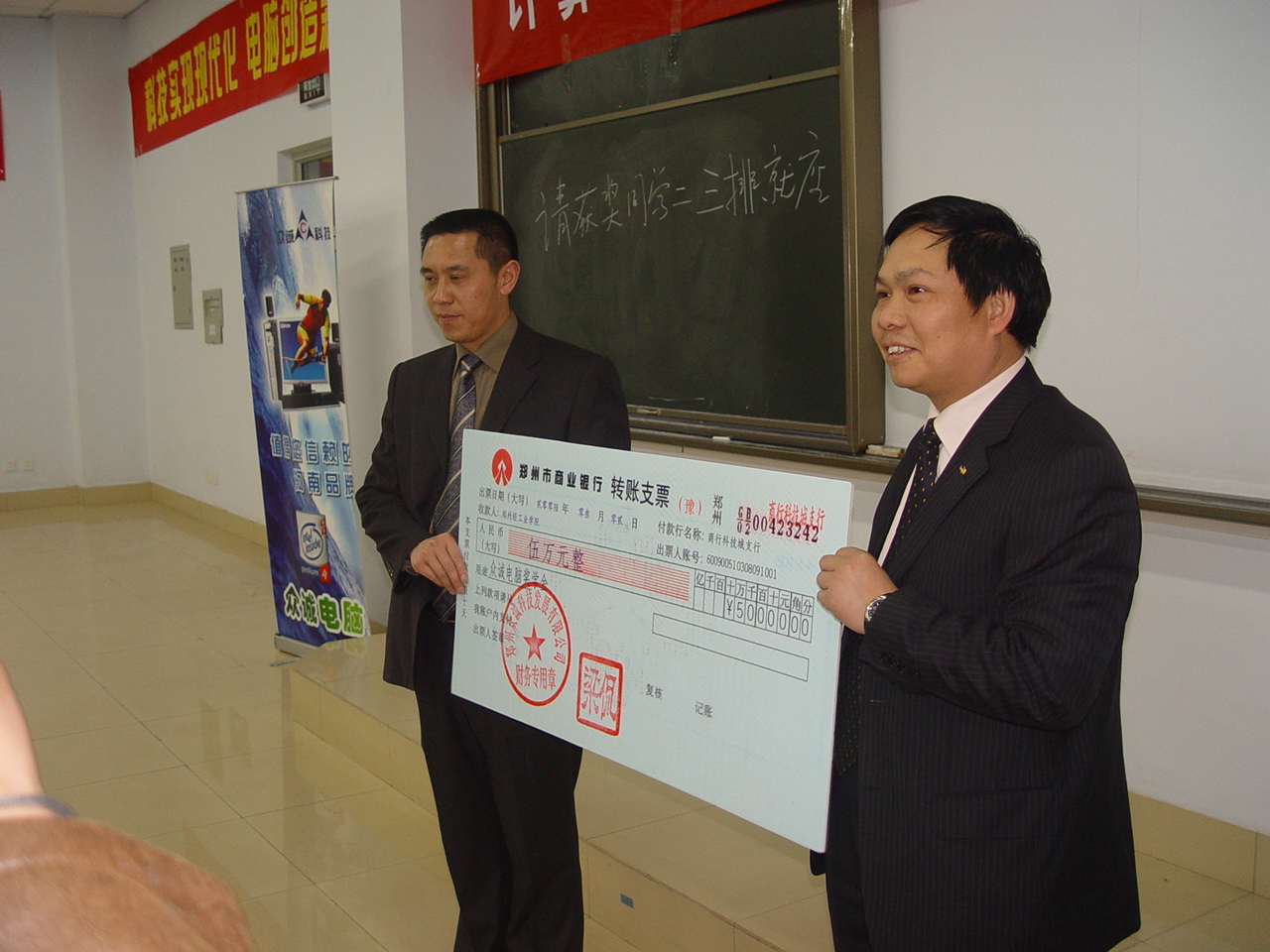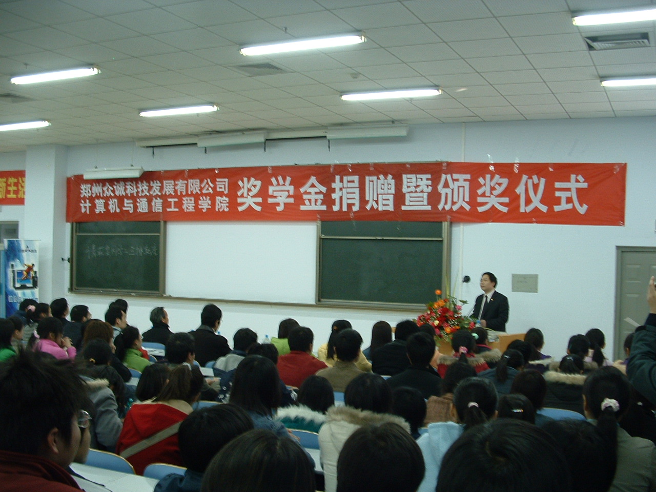 颁奖仪式上,计算机与通信工程学院甘勇院长感谢郑州众诚科技发展有限公司多年来对该院所给予的支持,并鼓励广大同学继续努力学习,再创佳绩。随后,众诚公司CEO梁侃先生为同学们作了一场热情洋溢的报告,并和与会同学就学习、就业以及IT行业现状等方面的情况进行了交流。