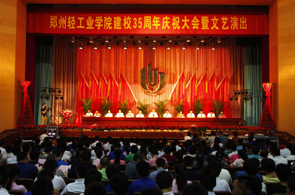 党委书记、校长剧乂文教授发表了热情洋溢的讲话。剧书记首先代表学校向出席庆典的领导、嘉宾、校友以及各界朋友表示最热烈的欢迎,向为学校建设发展做出贡献的离退休老同志和全体师生员工表示最衷心的感谢。他回顾了学校走过的35年不平凡历程,简述了学校在人才培养、学科建设、科学研究、社会服务等方面取得的主要成就,指出学校各项事业持续、快速、健康发展,取得了令人瞩目的成就,学校发展迈向了一个更高的平台。他强调,学校当前正处在一个新的历史起点上,面临着前所未有的发展机遇和挑战;35周年校庆是总结成就、汇聚力量的盛大聚会,是弘扬传统、凝炼精神的历史契机,更是反思历史、创新发展的全新起点。他讲到,面对前所未有的机遇和挑战,要有强烈的责任意识和忧患意识,认真总结经验和优势,深刻反思不足与差距,进一步增强知难而进的勇气和决心,奋发有为,开创未来:一要坚持人才培养主旨,建设创新型人才培育的高地;二要强化科学研究职能,建设科技领先的创新高地;三要突出社会服务功能,建设支撑经济社会发展的服务高地;四要坚守文化传承使命,建设文化传承创新的高地。他最后指出,在省委省政府的正确领导下,在社会各界的关心指导下,在广大校友们的鼎力支持下,全校师生员工同心同德、奋发作为,郑州轻工业学院的明天一定会更加灿烂、更加美好、更加辉煌!