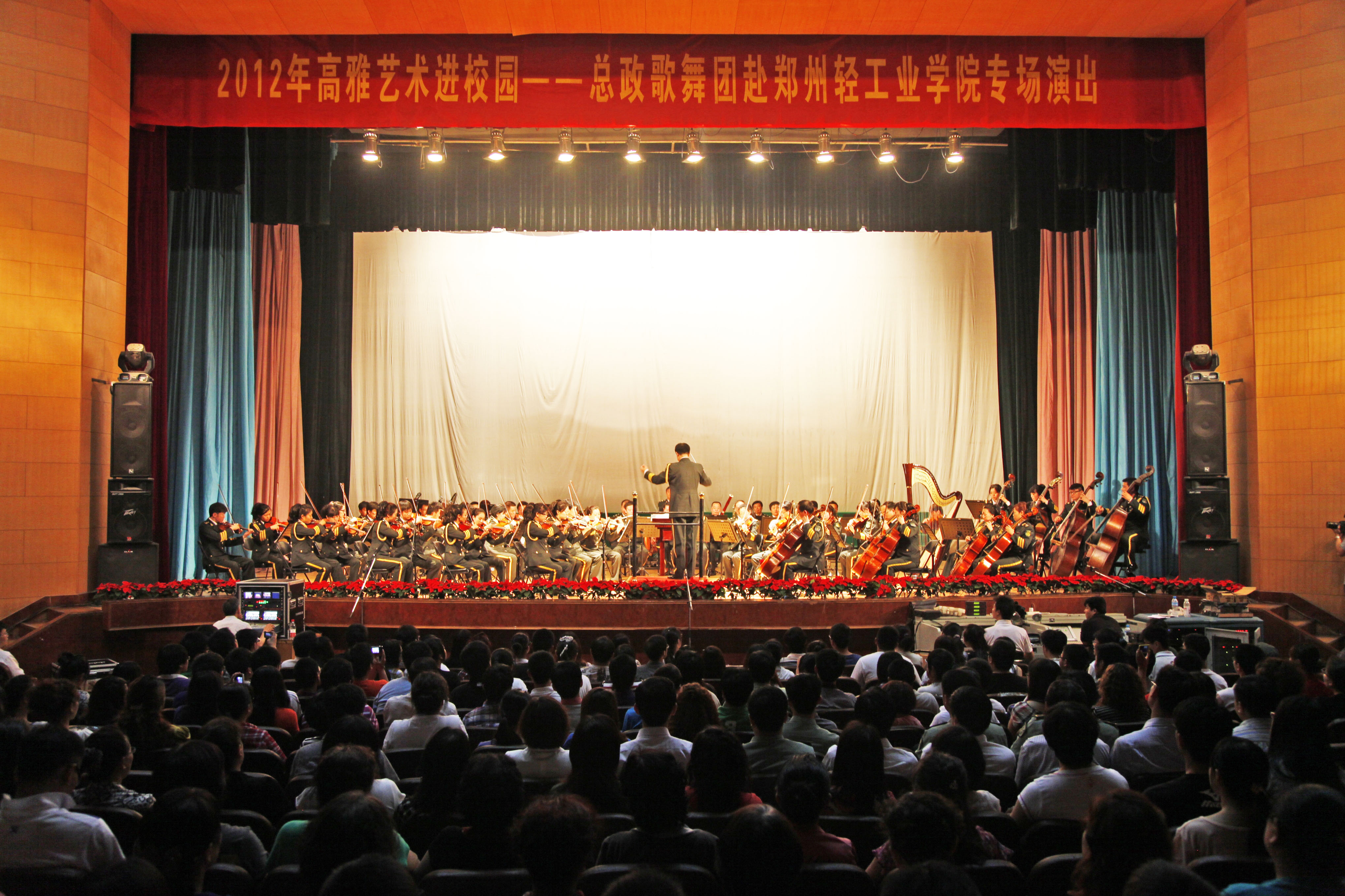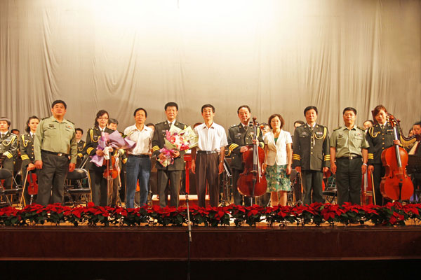 演出开始前,副校长陈江风发表了热情洋溢的欢迎辞,代表学校向总政歌舞团管弦乐团赠送了纪念品。演出结束后,校领导登台与演职人员握手致谢并合影留念。