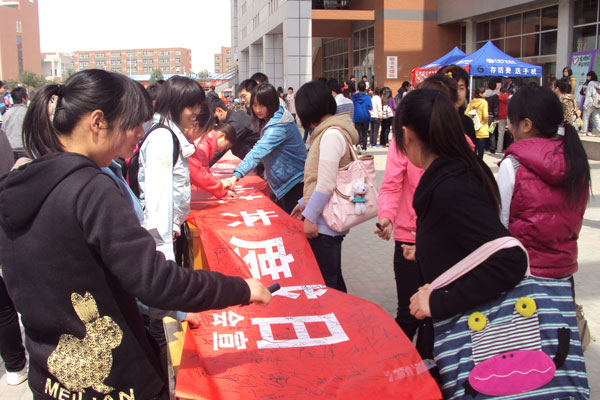 签名活动得到了众多同学的积极支持,他们纷纷在条幅上签下自己的名字,热情咨询活动的详细内容。许多同学表示要从自身做起,通过寝室、教室熄灯积极参与活动,有些同学还提出了有价值的意见和建议。