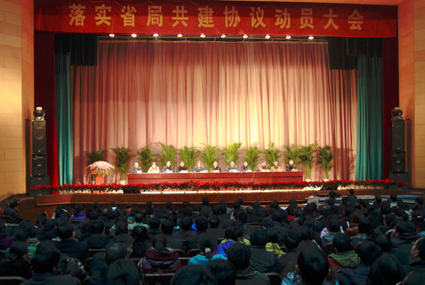 12月6日,我校落实省局共建协议动员大会在大礼堂召开。会议对学校前一阶段的工作进行了总结,对落实省局共建协议的工作和其他工作进行部署。并对在省局共建、卓越工程师教育培养计划、国家科技创新团队建设、香港邵氏基金资助四个专项工作中涌现出的先进单位进行了表彰和表扬。校领导林世选、剧乂文、张胜利、张希凡、窦效民、龚毅、陈江风、吕彦力、赵继红、安士伟、李世瑛出席大会,1000多名师生员工参加大会。会议由党委副书记张胜利主持。