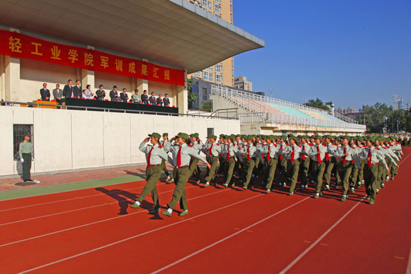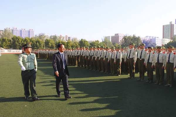 雄壮的军乐声中,党委书记、校长剧乂文在承训部队首长的陪同下检阅军训方队。参训新生军容严整、队列整齐、精神饱满、口号响亮,充分展示了军训成果。