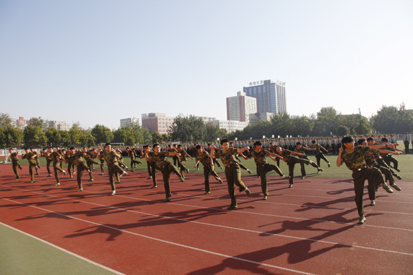 分列式科目汇报时,各个军训方队依次从主席台前正步走过,接受学校领导和部队首长的检阅。新生们队列整齐威武,口号铿锵有力,表现出了高昂的士气,展示了良好的军训成果。随后,参训学生以昂扬的斗志、有素的动作,表演了立正、稍息、跨立、敬礼、齐步走、正步走、跑步走、军体拳等军训科目。精彩的汇报表演不时赢得阅兵领导和现场观众的热烈掌声。