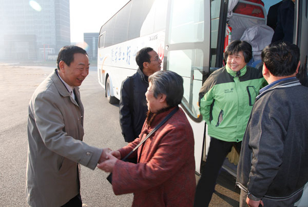 离退休老同志们刚下车,党委书记、校长剧乂文和副校长、科学校区管委会主任安士伟等领导立即迎上前去,与老同志们亲切握手、问候,热情欢迎他们来到学校的重要组成部分科学校区实地参观。