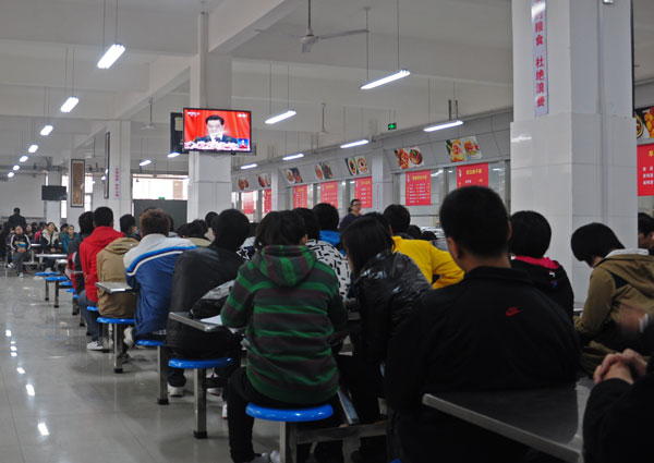 在校办公楼二楼大会议室,校领导剧乂文、窦效民、龚毅、陈江风、吕彦力、赵继红、安士伟、李世瑛,与机关处室负责同志和部分工作人员共同观看了大会盛况。在无课教室、学生食堂、学生宿舍等具备收看直播条件的场所,教职工和青年学生围聚到一起,通过电视或网络集体观看了大会直播。