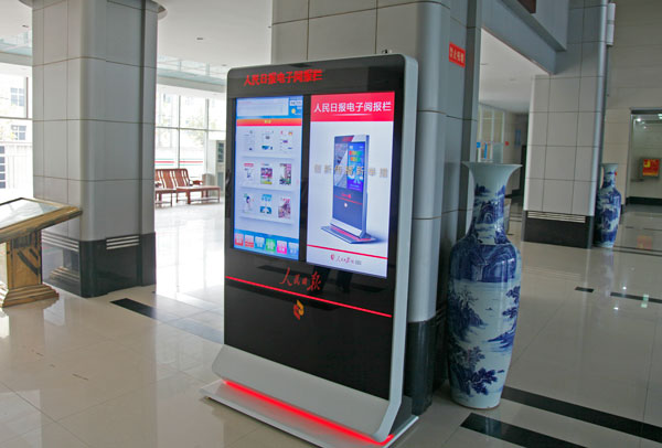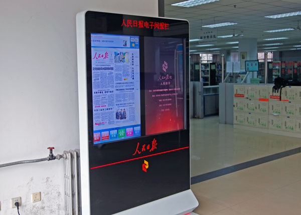 该阅报栏项目是人民日报社从传统纸媒向现代数字化全媒体战略转型而设立的全新互动新媒体项目,采用无线传输方式实时更新内容,具有传输速度快、容量大、画面清晰、人屏互动等特点,阅读者可通过触摸点击方式,查阅《人民日报》、《国际金融报》、《文史参考》等报刊的电子版,以及登录浏览人民网网页内容。