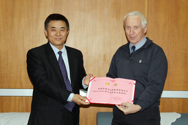 受校党委书记、校长剧乂文教授委托,吕彦力副校长为韦恩•浦兰博士颁发了聘书。他指出,澳大利亚格里菲斯大学是世界500强学校,与我校建立友好关系已十余年,双方一直保持着学生、教师互访等友好交往关系。2010年6月,双方签署了本科层次合作办学框架协议,确立了合作课程,目前每学期都有格里菲斯大学的相关老师来我校授课,我校也已有部分学生到该校就读。韦恩•浦兰博士为两校的友好合作交流做出了突出贡献,殷切希望韦恩•浦兰博士对我校相关学科建设、青年教师培养等方面给予指导和帮助,希望进一步加强双方友好交流与合作,提升中外合作办学质量和层次。