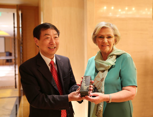 作为琼·斯特林格女士的老朋友和尊贵客人、中国人民对外友好协会前会长陈昊苏先生和我校党委书记、校长剧乂文教授应邀发表即席演讲。在发言中,剧乂文书记回顾了斯特林格女士担任爱丁堡龙比亚大学校长期间取得的突出成就,赞扬了斯特林格校长非凡的领导力及其率领的团队对两校合作所付出的辛勤努力,表达了对斯特林格校长的依依惜别之情及对其退休生活和两校未来合作与发展的美好愿望。剧书记热情洋溢的致辞受到了与会嘉宾的高度认同和赞扬。