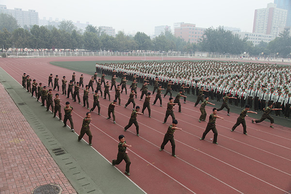 随后,标兵就位,迎校旗。分列式正式开始,来自各院系的新生方队依次出场,整齐划一、气势恢宏,同学们自信昂扬地走过主席台接受检阅,展示了大一新生自强向上的优良素质。参训学生以高亢昂扬的斗志、训练有素的动作,表演了立正、稍息、跨立、敬礼、齐步走、跑步走、军体拳、军棍操等训练科目。精彩的汇报表演不时赢得阅兵领导和现场观众的热烈掌声。