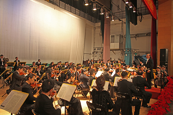 音乐会以一曲充满了河南豫剧特色的《朝阳沟序曲》拉开序幕。序曲音乐在大家耳熟能详的豫剧《朝阳沟》旋律的基础上,采用了交响乐式的展开,表现出一种中西交融、具有现代气息的音乐风格,给传统戏曲音乐赋予了新的生命力。随后,富有民族特色的《瑶族舞曲》、热情如火的《卡门组曲》、乐队首席刘志云先生精彩的小提琴独奏《沉思》、新疆民歌改编的《掀起你的盖头来》,以及震撼人心、经久不衰的《贝多芬命运交响曲》第一乐章等交响乐曲目纷纷呈现,精彩的演出无一不牵动着现场听众的心,赢得台下阵阵热烈的掌声。最后,《拉德斯基进行曲》将整场音乐会推向高潮,现场师生不禁跟随乐队指挥、按着音乐节拍鼓掌,与台上精彩的演奏合拍同调。一时间,掌声、音乐声激荡在整个礼堂。音乐会在现场师生激动的欢呼声中圆满结束。
