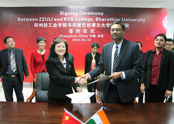 赵继红副校长代表学校欢迎客人的来访。她在向客人介绍学校概况之后表示,郑州轻工业学院与巴拉蒂尔大学RVS文理学院有着良好的合作基础,希望双方进一步拓展合作。RVS文理学院执行校长K.Senthil Ganesh感谢我校的热情接待,并就RVS学院的办学及软件人才培养情况进行了介绍。会谈中,双方就专科生和本科生的联合培养、交换生项目、教师互访进行了讨论磋商,