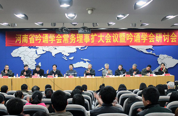 12月14日,河南省吟诵学会常务理事扩大会议暨吟诵学术研讨会在我校隆重举行。中国诗歌研究中心、中华吟诵学会、河南省吟诵学会、国内各高校文学院代表以及特邀代表近60人参加大会。会议分吟咏学专著首发暨赠书仪式、吟诵倡议与展示、主题讲座暨学术研讨三个阶段进行。