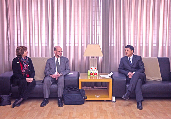 石恒真校长代表学校师生对来自纽约州立大学布法罗学院的客人表示欢迎。在对我校情况进行简要介绍之后,石恒真校长表示,郑州轻工业学院与纽约州立大学布法罗学院有着良好的合作基础,希望尽快落实双方已达成的协议,在此基础上进一步拓展合作空间。石恒真校长也请司福森院长、帕特森院长转达他对纽约州立大学布法罗学院校长的问候,并真诚邀请纽约州立大学布法罗学院校长在方便的时候对我校进行友好访问。
