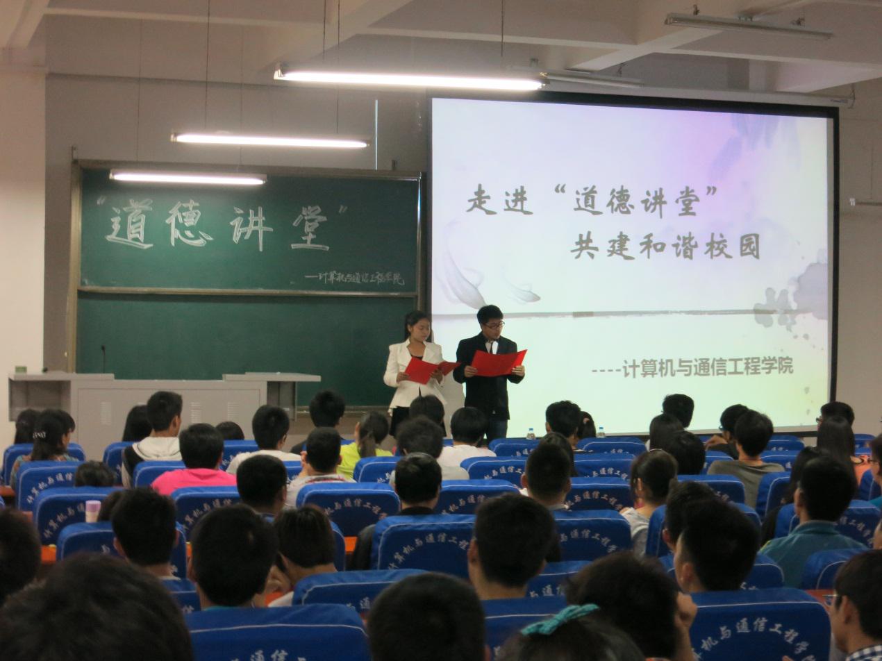 5月8日晚,学校文明办主办、计算机与通信工程学院承办的“道德讲堂”活动在科学校区计算机楼217举行。活动以“走进‘道德讲堂’,构建文明校园”为主题,吸引了近300名师生参加活动。